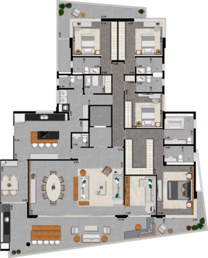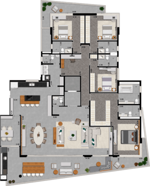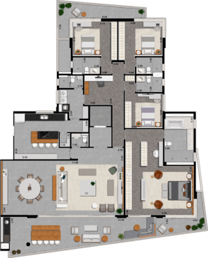 4 SUÍTES BANHOS SR. E SRA. SALA DE ESTAR E JANTAR COPA DEPENDÊNCIA DE SERVIÇOS HOME THEATER VARANDA GOURMET